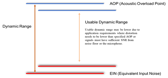 The dynamic range of a MEMS microphone is characterized by the acoustic overload point (AOP) and the noise floor of