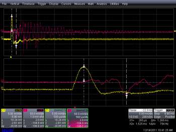 The red box in the lower right corner of the figure outlines the readout from the cursors. In this example the tall peak on channel 1 is at 215 usec (measured relative to the trigger time of the scope) and the first large negative going peak on channel two is at 1.455 ms. This gives a "delta t" of 1.240 msec between the events on the two sensors. An engineer can get a better view - and a more accurate measurement - by using the simplest viewing tool in the digital oscilloscope - the zoom function.