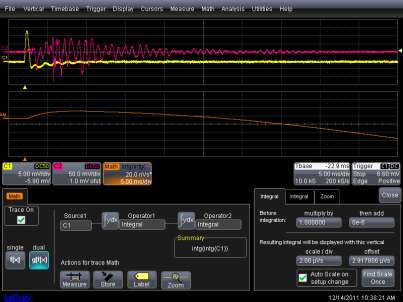 The ability to rescale a waveform into the physical units which the sensor detects also enables the digital oscilloscope to perform more advanced math operations that have useful meaning concerning the real world functioning of the sensor. A sensor that measures acceleration is measuring the mathematical derivative of velocity. And velocity is the derivative of position. So if an oscilloscope has a waveform that shows the output of an accelerometer over a period of time then the scope can integrate that waveform to obtain a new waveform that shows the moment by moment velocity experienced by the sensor over the same time period. If desired, the scope can integrate the velocity waveform to show the displacement in position as a function of time. Of course the oscilloscope will probably not know if the definition of "gravity" is earth standard of 32 ft/sec2 so the rescale function may need to be used again. An example of a math setup for double integration is shown in Figure 5.