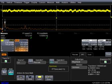 Another common type of mathematical analysis is to look at the frequency domain view of a sensor reading. This is particularly true if the sensor shows some sort of repetitive structure in the value of its readout or if the user suspects there is some source of noise interfering with sensor operation. In this case an FFT of the sensor signal may give an indication of the source of the noise. In the case of the accelerometer signals shown in Figures 1-3 it may be interesting for the scope user to know the frequency spectrum of the ringing. The ringing behavior will be different for different types of coupling (i.e. protective materials) between the point of impact of an impulse and the sensor. If we did an FFT of the example shown in Figure 4 the frequency spectra would give insight into physical shaking of a fan. Figure 6 shows the setup of this type of frequency analysis using the same signal as was shown in Figure 4. Channel 1 of the oscilloscope captures the output of the sensor attached to the fan body. This is the upper trace. The math setup shows a rescale, then an FFT. The purpose of the rescale is to compute parameter P2 - the "max" of the rescaled math trace. This is the maximum acceleration detected by the sensor, 5.5009 milligravities.