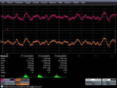 Most products have to meet certain specifications, or should respond in a specified manner when subjected to a particular stimulus. A digital oscilloscope can help greatly in testing key signal characteristics or in documenting product response to a specified stimulus. All digital oscilloscopes measure signal parameters - some make more measurements, and more complex measurements, than others. Figures 4, 6 and 7 show some basic parameter measurements of peak-to-peak and maximum signal excursion. Oscilloscopes can also measure signal rise time, fall time, overshoot, pulse width, interval between two edges on a signal, the time between an edge on one signal and the arrival of an edge on a different signal and a host of other parameters. Sometimes the user just wants the oscilloscope to measure parameters for the acquisition that is shown on the screen. But in other cases it is necessary to test operation of a device over many iterations to prove the parameters of interest are always within specification. In Figure 8 the voltage waveform from an accelerometer is shown in the upper trace. The lower trace is the "rescaled" waveform using physical units (gravities). This example applies equally to any type of sensor for which the engineers wants to test certain key signal characteristics. In this particular example, the oscilloscope has acquired 238 acquisitions of the waveform (the "num" parameter near the bottom is the number of acquisitions).