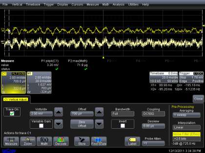 The FFT could be performed on either the voltage vs time trace or the rescaled trace. Both traces have the same shape and the same spectral components. In this example the peak of the FFT is at 120 Hz as shown by the cursor reading toward the lower right of the screen image. Once the user has the math setup that is desired, the math menu can be closed so the entire viewing area of the screen can be used for examining the acquired waveform and the FFT. This is shown in Figure 7.