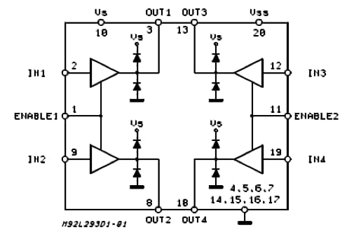 L293 chips that do not have the diodes, so be sure to pick the right ones when ordering. The diodes are key in preventing blowback voltage from the motor coils, which would likely fry your microcontroller. Blowback voltage results when the power to the relay coil gets switched off and the magnetic field starts to fade. Current can flow back into your microcontroller if you leave it unprotected without a diode.