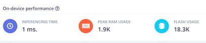 One final bit of performance analysis is also tied to the embedded platform you selected. As every microcontroller has varying hardware features and specifications, the performance of a model can vary significantly. Parameters such as operating frequency and the amount and speed of memory (flash and RAM) are among the chief factors. Edge Impulse can estimate your model's real-time performance for numerous, leading embedded platforms. Edge Impulse will estimate the inference time, RAM usage, and flash memory usage (Figure 2). Inference time is the time elapsed between the neural network being presented with new input data and when the model provides an output in the form of a predicted classification of the input signal. Typically, this will be measured in milliseconds. RAM and flash usage are presented as the peak memory required to perform the inference, which will likely be measured in kilobytes for embedded systems.
