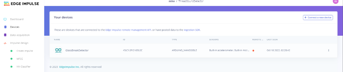 At this point, we simply need to flash the firmware and launch the serial daemon. Conveniently included in the firmware repository are Windows, Mac OS, and Linux scripts to automate this process for select development boards, including the Nano 33 BLE Sense. If you haven’t done so already, create an account and log in to the Edge Impulse Studio (https://studio.edgeimpulse.com). Then click on the Devices tab to ensure your development board successfully made contact with the Edge Impulse service (Figure 1). With all that done, it’s time to deep dive into the real focus of this article, how to train a new model from scratch.