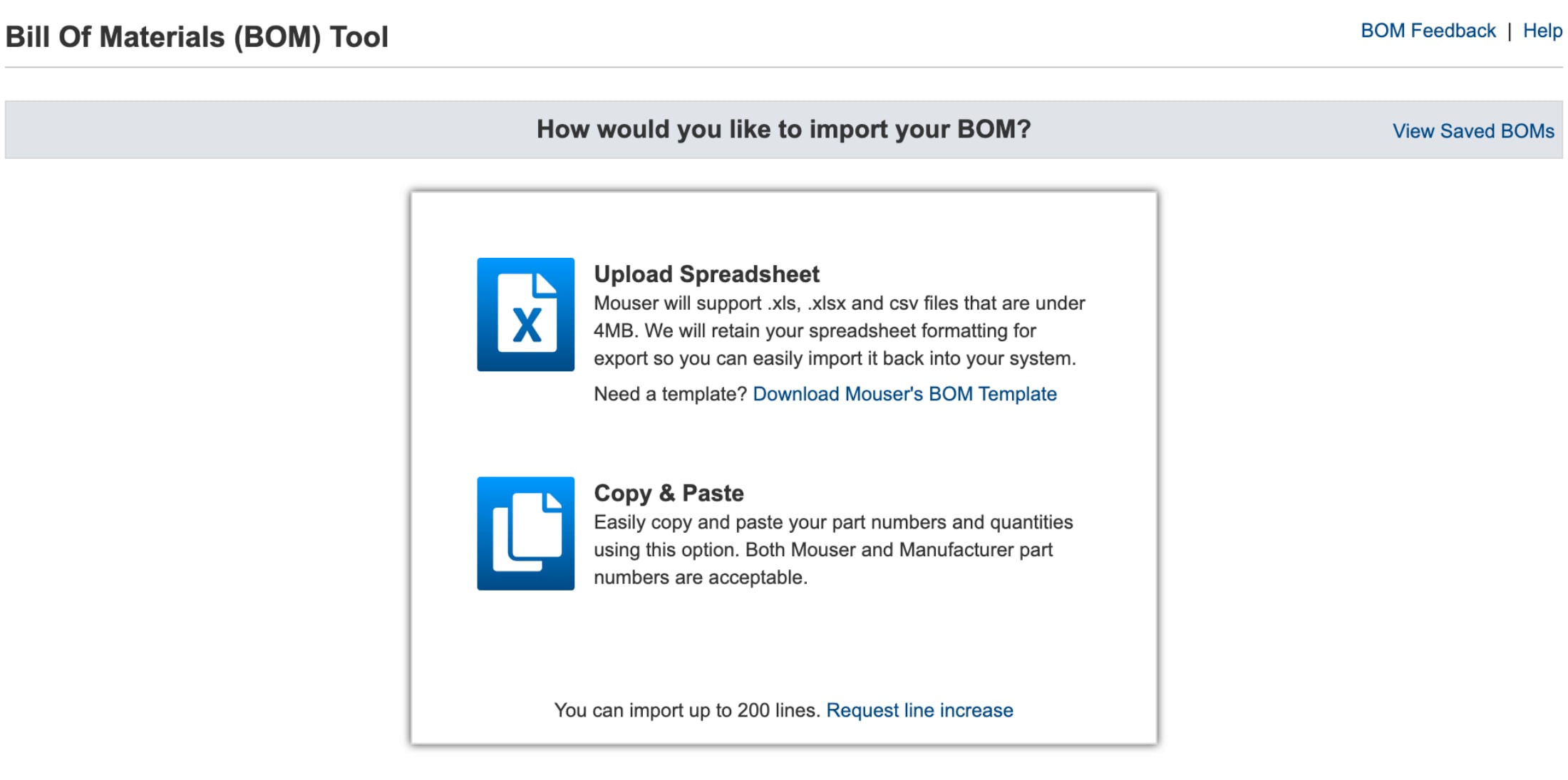 La herramienta BOM de Mouser le permite importar sus datos de dos maneras: