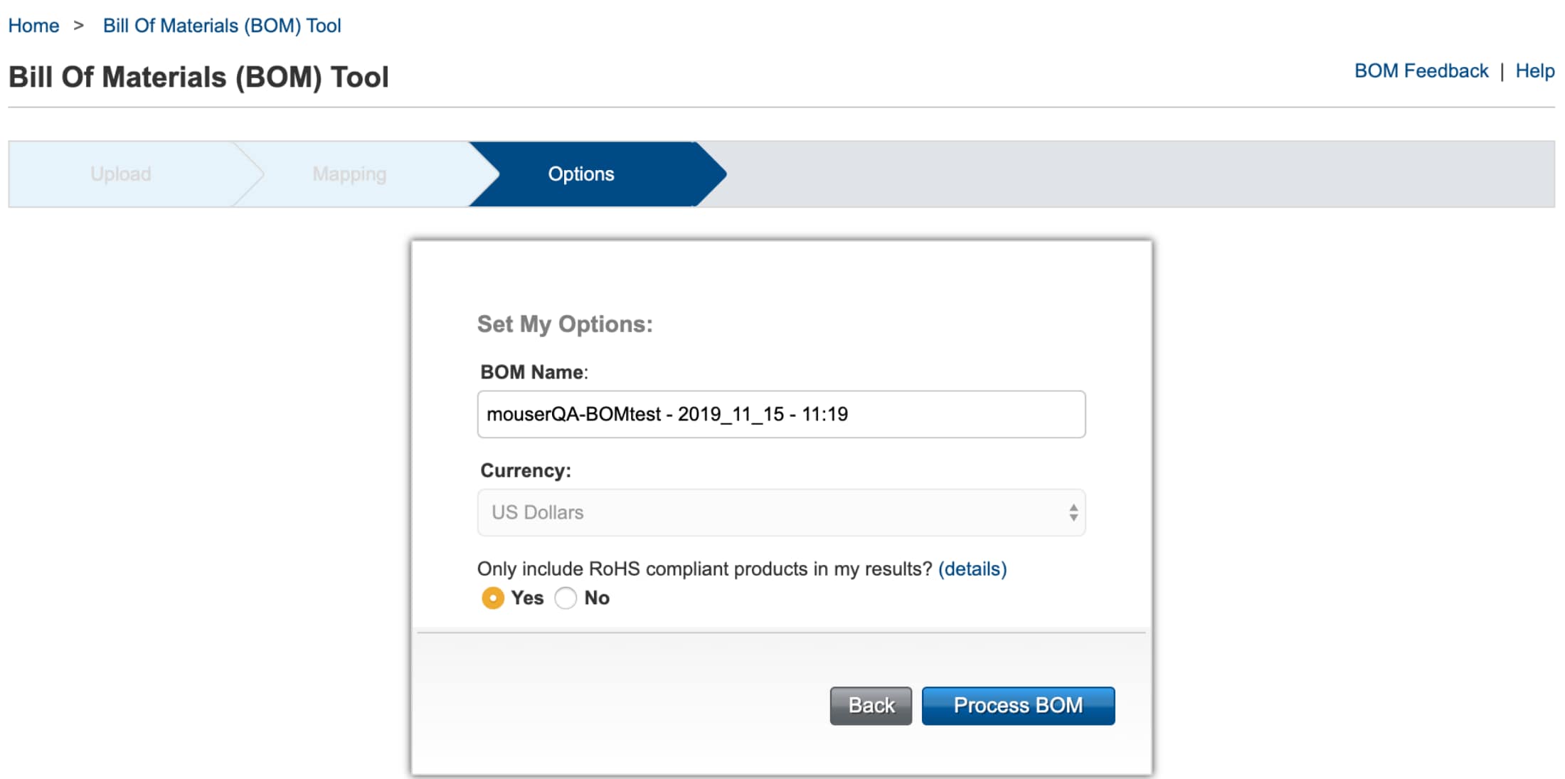 - Sí - Filtra las coincidencias de BOM para proporcionar solo los productos que cumplan con las normas RoHS.